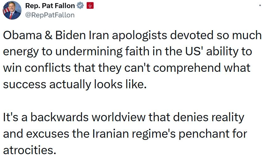Texas Rep. Pat Fallon just nailed it: years of Obama and Biden coddling the Iranian regime and talking down America’s fighting spirit have left their apologists completely blind to what real success against a terrorist state actually looks like.